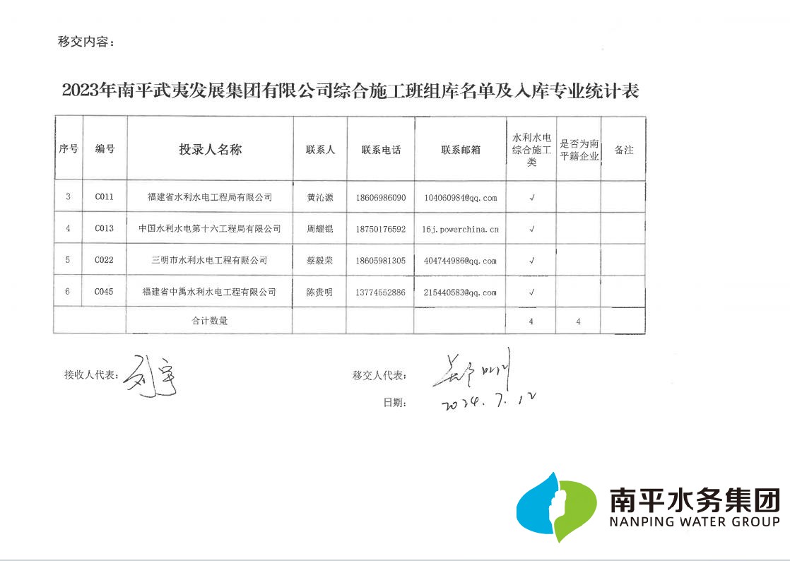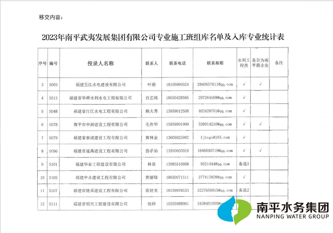 上述两类施工班组名单的组建主体为武夷发展集团,其资质基础、相关管理依据均源于该集团,且建库涉及的相关资料与办理程序,均由武夷发展集团留存备案。基于业务调整需求,该两类名单于2024年7月移交我集团(南平水务集团有限公司),作为工程合作的参考依据使用。